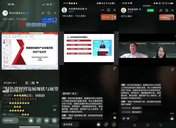 5 月 29 日晚,秀洲光伏科技馆《“暾说”微讲堂》第 2 期“绿色建材的发展现状与展望”线上研讨会成功举行。参与此次直播的嘉宾是来自住房和城乡建设部科技与产业化发展中心建材首席研究员,教授级高级工程师刘敬疆处长,本次直播由中国绿色供应链联盟光伏专委会光伏回收产业发展合作中心副秘书长刘莉敏主持。此次活动在三个平台同步直播,吸引了线上近 8000 人观看,反响热烈。
